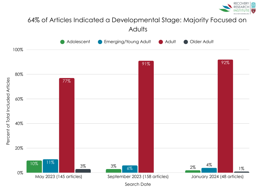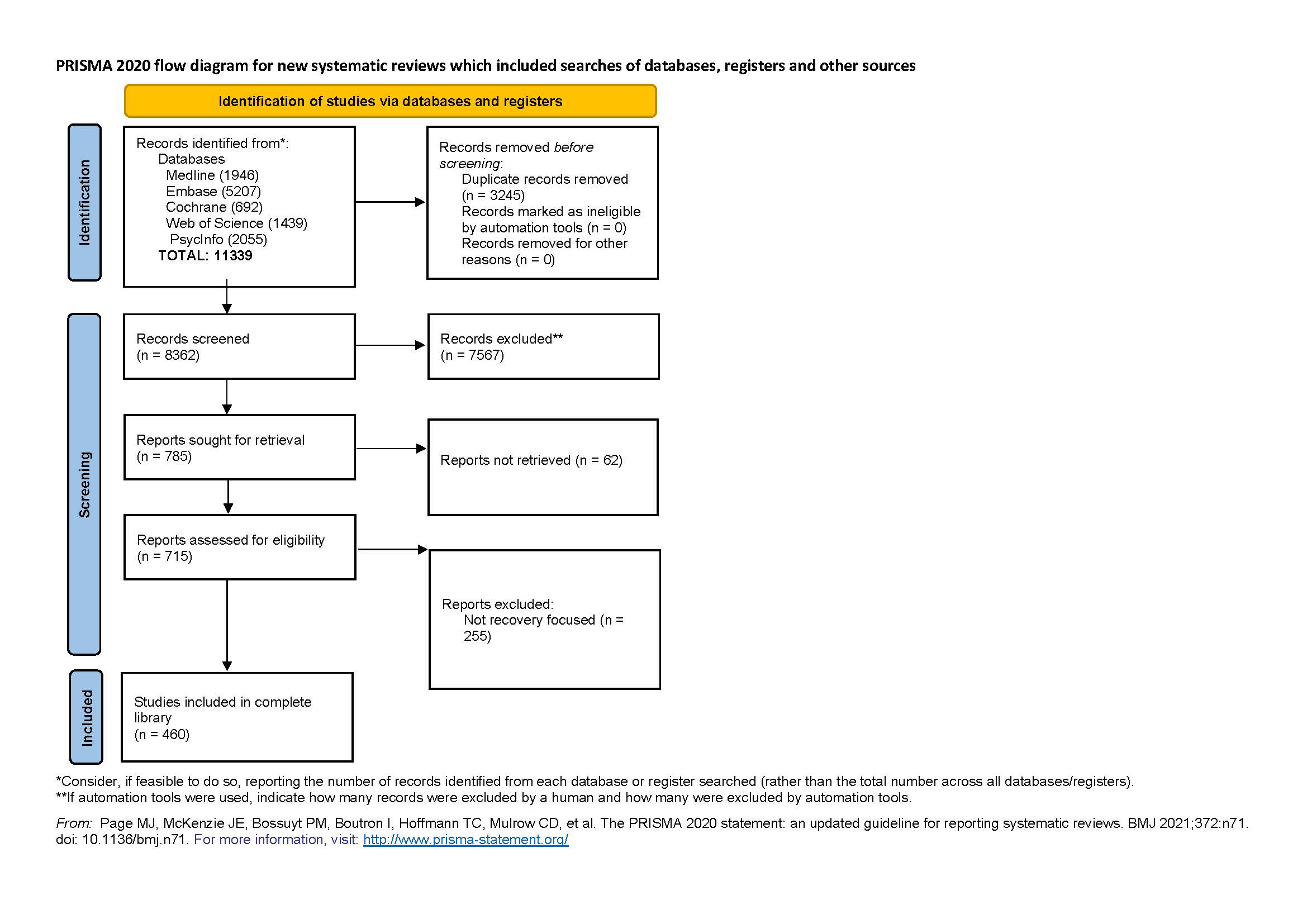 Search. The search strategy was developed and implemented by Melis Lydston, a medical librarian and Knowledge Specialist for Research & Instruction at the Treadwell Library. Electronic searches for published literature were conducted using Ovid MEDLINE (1946 to present), Embase.com (1947 to present), Web of Science (1900 to present), Cochrane Central Register of Controlled Trials (CENTRAL) via Ovid (1991 to present) and PsycInfo (1967 to May Week 2 2023). To avoid the potential to contribute to publication and/or reporting bias, we do not have inclusion criteria to screen out non-peer reviewed studies (e.g., dissertations, conference presentations) and include them when relevant. The search strategy incorporated controlled vocabulary and free-text synonyms for the concepts of youth, adults, substance abuse disorders, treatment, and recovery. Search strategies for each database can be found here: dates listed will be updated quarterly for the actual search our team conduct, but this document uses the final search from September 2023 (no keywords or terms have been changed since). No restrictions on language were applied. An adapted age filter was used and a date limit from 2022 to present was used for the first search since RRI acquired the Bibliography (May 2023). The most recent search was conducted in September of 2023. The PRISMA flow diagram, below, will be updated on a quarterly basis, after the screening process for that quarter has been completed.