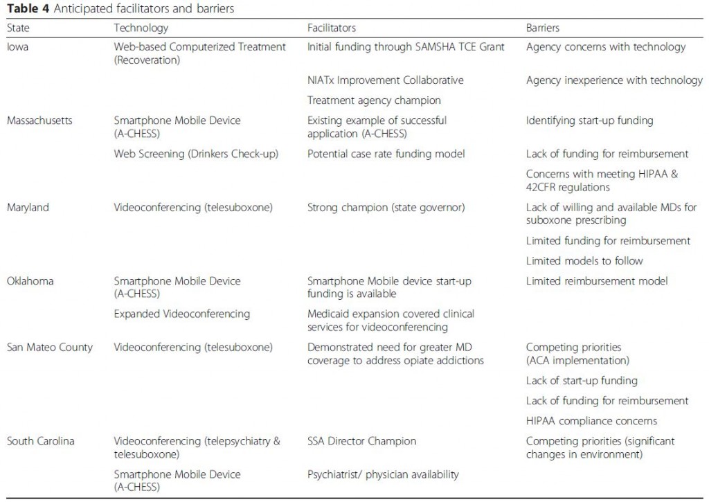 Facilitators and barriers to implementation of telemedicine for addiction – 21st century Addiction Treatment – Integrating Technology into Community Programs – Molfenter-Table