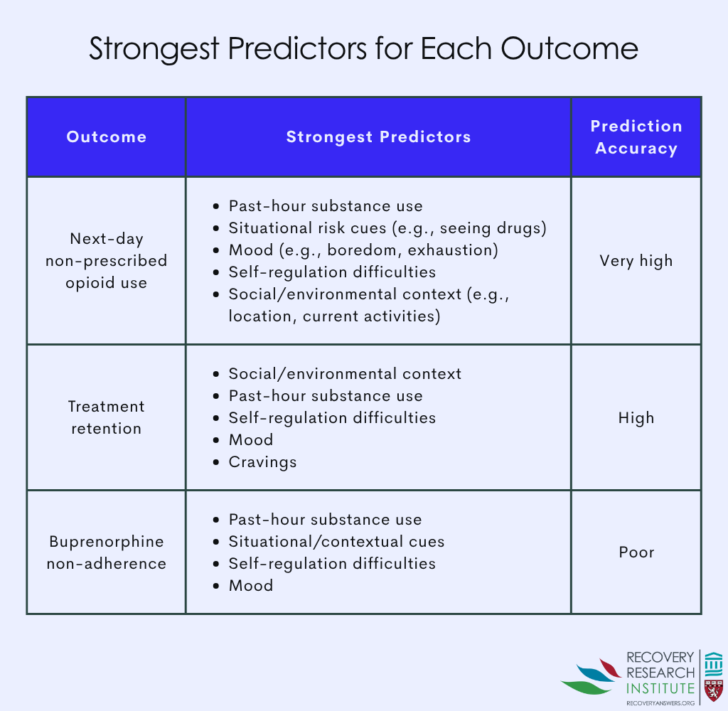 Findings highlight the potential for smartphone and other digitally collected psychological and contextual data to predict both self-reported outcomes such as non-prescribed opioid use and objective outcomes from electronic health records, such as buprenorphine nonadherence and treatment dropout. The study also identified different time windows of risk. Some predictors – such as mood, particularly boredom and exhaustion, and being in high-risk contexts where substance use was present – signaled elevated risk for non-prescribed opioid use within hours. Other predictors, such as stress and pain, forecasted relapse risk several days in advance. However, the study did not report, if a certain risk factor was present, how many days it would take for the negative outcome to occur (i.e., opioid use). Most predictors of treatment retention operated at higher time latencies, with mood, self-regulation, cravings, and pain forecasting treatment discontinuation several days in advance.