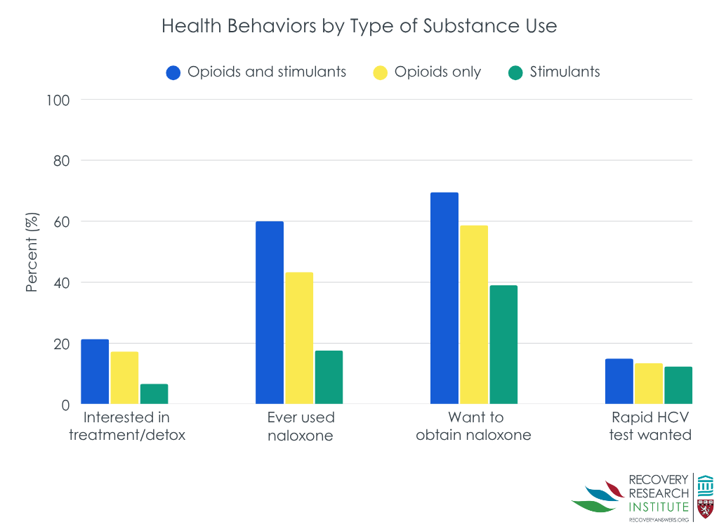 As shown in the graph below, compared to people who inject drugs using opioids only, people who inject drugs co-using opioids and stimulants had 2 times greater odds of using naloxone and 2.5 times greater odds of interest in a rapid HIV test. Compared to people who inject drugs using stimulants only, people who inject drugs co-using opioids and stimulants had 7 times greater odds of using naloxone and 4 times greater odds of interest in treatment/detox.