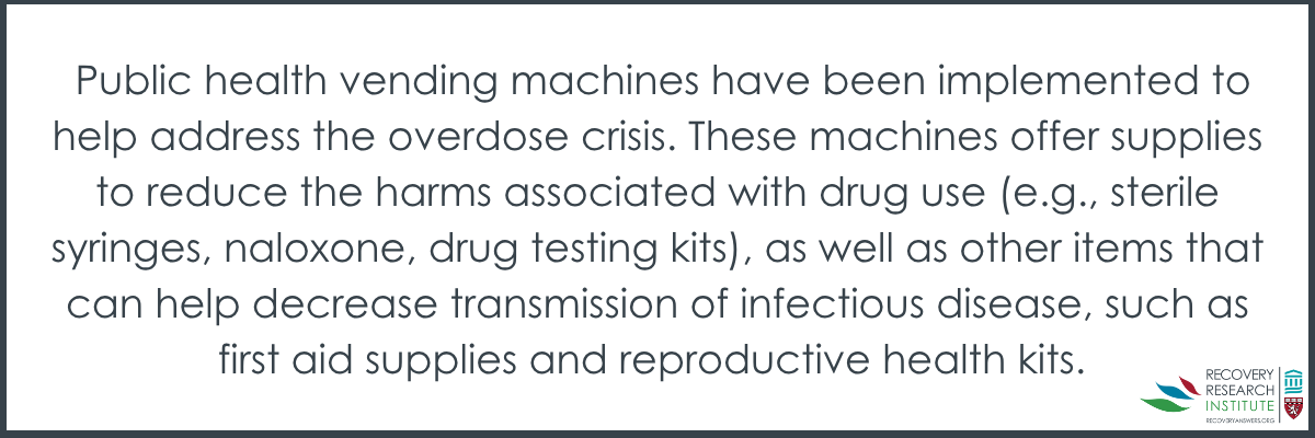 Public health vending machines have been implemented to help address the overdose crisis. These machines offer supplies to reduce the harms associated with drug use (e.g., sterile syringes, naloxone, drug testing kits), as well as other items that can help decrease transmission of infectious disease, such as first aid supplies and reproductive health kits. In the US, the first public health vending machines were installed in Clark County, Nevada, in 2017 by Trac-B, the non-profit arm of the Harm Reduction Center-Las Vegas. Trac-B currently operates 6 vending machines in Las Vegas that are located near community organizations and clinics that serve people who use drugs.
