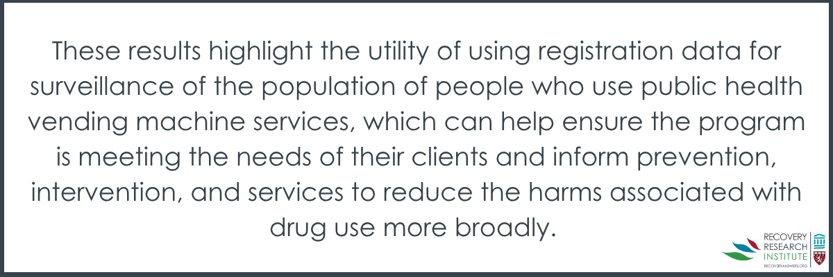 More knowledge about who is using public health vending services can provide data on recent drug use trends and also inform prevention and intervention efforts. Researchers in this study used such data to examine the demographics and drug use behaviors of people who registered for these vending machine services, including co-use of opioids and stimulants.