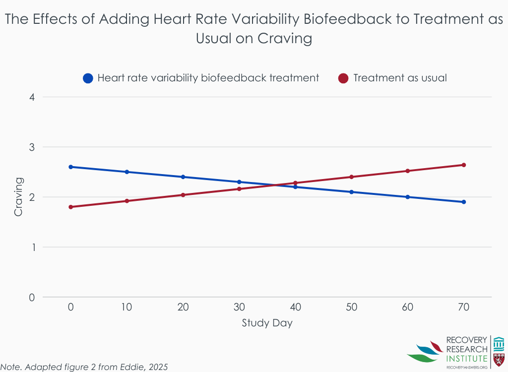 This was a study of people in their first year of recovery receiving a variety of services (or no services) randomized to receive heart rate variability biofeedback or not. The heart rate variability biofeedback group reduced their craving and negative affect; the intervention may interrupt the pathway from craving to substance use. This is promising because individuals only practiced for approximately 10 minutes per day yet experienced less craving and negative affect over time. It is unclear why the intervention reduced negative affect and stress over the course of the trial, but not substance use – this was lower in the intervention but started out that way and did not change during the trial. Because there was no breathing placebo condition, we do not know whether the presumed active ingredient of the intervention – the specific breathing technique – caused the better outcomes or if any breathing technique would serve that purpose. Nevertheless, this low barrier intervention thus may be a useful tool for individuals in recovery. In particular, training intended for use of resonance frequency breathing during acute moments of craving may lead to reductions in substance use. The heart rate variability biofeedback did not, however, impact positive affect, suggesting that those who use substances to increase positive affect, rather than to decrease negative affect, may receive less benefit. Even so, these results highlight a promising new clinical approach that is accessible via smartphone, and available for use outside of the clinic in real world situations of stress that can reduce the impact stress may have on cravings and subsequent alcohol and other drug use.
