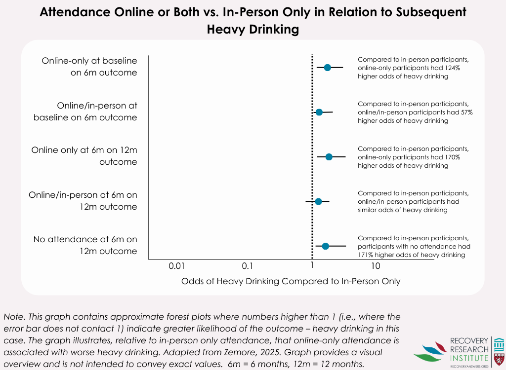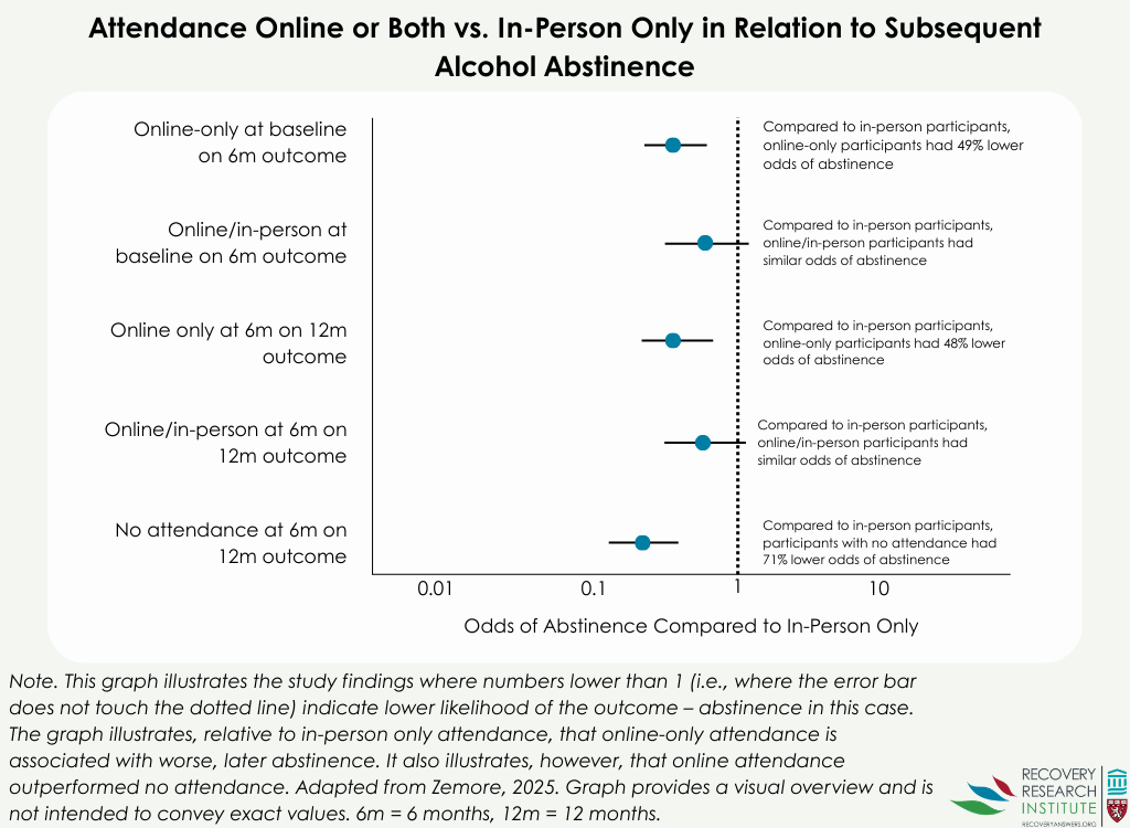 Decades of research show that in-person participation in mutual-help groups – particularly meeting attendance combined with active group involvement beyond simply attending meetings (e.g., having a sponsor, speaking at meetings, engaging in service or leadership roles) – is associated with improved alcohol outcomes, including higher rates of abstinence and fewer alcohol-related problems. In recent years, however, online mutual-help group meetings have expanded rapidly, especially during and after the COVID-19 pandemic. Online meetings may improve access for individuals who face barriers to in-person attendance, such as geographic isolation, mobility limitations, stigma, or competing work and family responsibilities. Despite their growing use, relatively little is known about whether attending online meetings is as effective as attending in person, or whether combining online and in-person participation yields similar benefits.