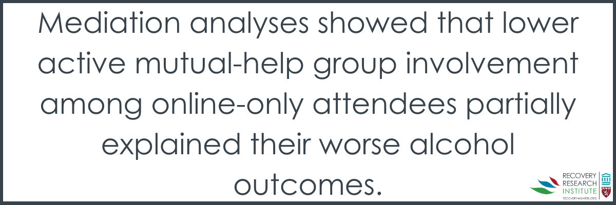 Consistent with past studies, participants who attended online meetings only, reported significantly lower levels of group involvement than those attending meetings in person only. In contrast, the online/in-person group reported involvement levels similar to those of in-person only attendees. Mediation analyses showed that lower active mutual-help group involvement among online-only attendees partially explained their worse alcohol outcomes. Importantly, higher involvement was associated with better alcohol outcomes regardless of attendance mode. On the averaged mutual-help group involvement scale, controlling for other variables, going from 0 to 1 (i.e., meeting all 5 involvement indicators) increased the odds of abstinence almost 4-fold (3.81). It also was associated with significantly lower likelihood of heavy drinking and (non-significantly) lower likelihood alcohol-related problems.