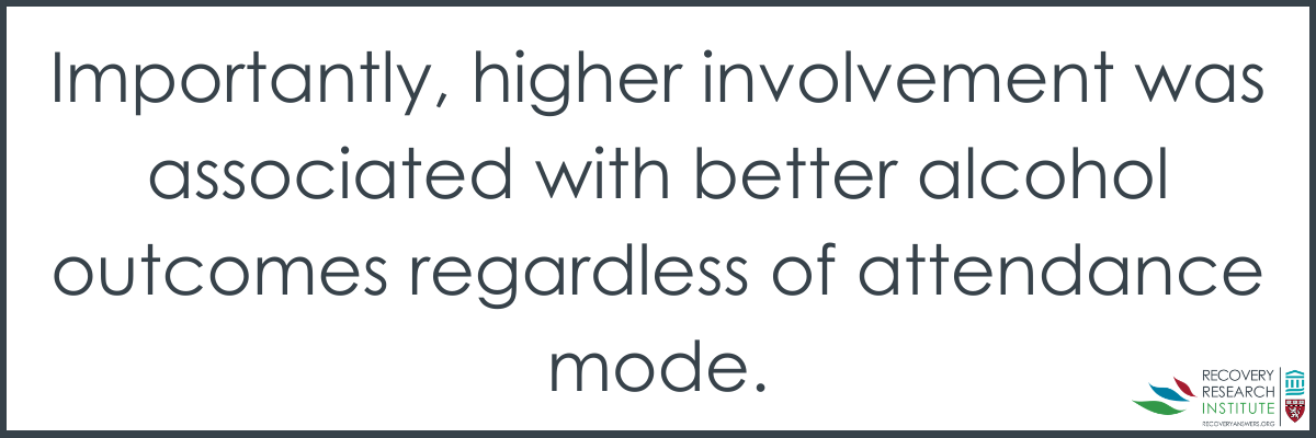 In addition, earlier studies did not examine whether differences in alcohol outcomes across attendance modes could be explained by differences in levels of group involvement, nor whether involvement provided similar benefits regardless of how meetings were attended.