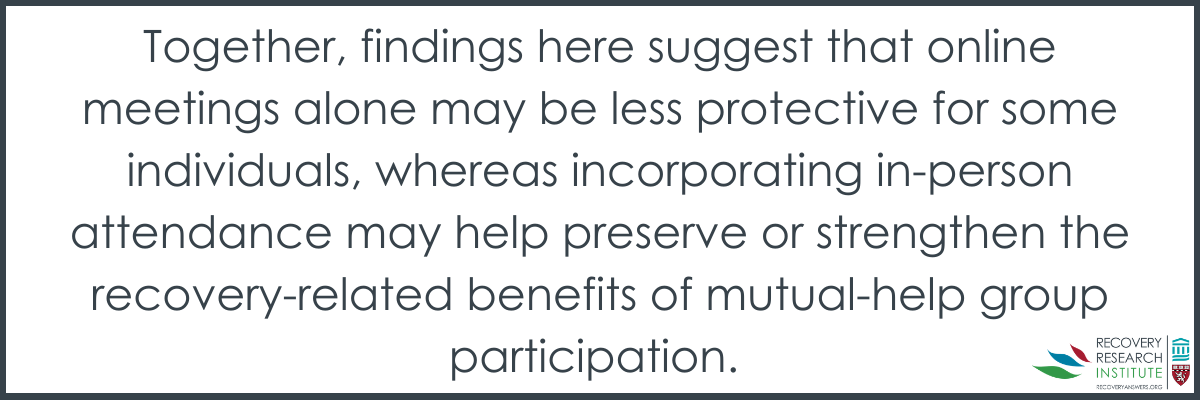 A small number of recent studies using the same underlying data source as the present study examined associations between mutual-help group attendance mode and alcohol outcomes. These studies found that any form of mutual-help group participation – online, in-person, or both – was generally associated with better alcohol outcomes, including higher odds of abstinence and lower odds of heavy drinking and alcohol-related problems. However, individuals who attended meetings exclusively online tended to report lower levels of group involvement than those attending in-person only.