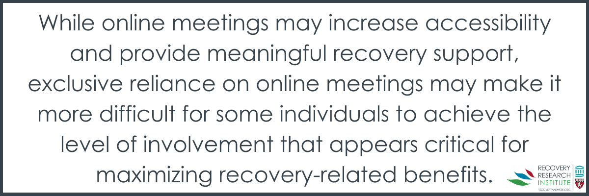 Importantly, higher involvement was associated with better alcohol outcomes regardless of attendance mode, reinforcing prior evidence that mutual-help group involvement predicts better recovery-related outcomes beyond meeting attendance alone. Although online meetings may be helpful for individuals who are able to become actively involved (e.g., obtaining and working with a sponsor, etc.), achieving this level of engagement may be more challenging without in-person participation. In part, this may because at in-person meetings, there are greater opportunities for informal social connection – the ones that are made prior to and following the actual meeting (the so-called “meeting before the meeting” and “the meeting after the meeting”). Online meetings do not lend themselves well to such pre- and post-meeting side conversations, because everyone is always together typically on one screen making this very difficult. Thus, obtaining or chatting with a sponsor or exchanging phone numbers with other participants is more difficult to achieve. Such results underscore the importance of strategies that actively promote more active involvement among online attendees, such as encouraging regular attendance, finding a way to foster peer connections outside of meetings, and expanding opportunities for service and leadership in the virtual settings.