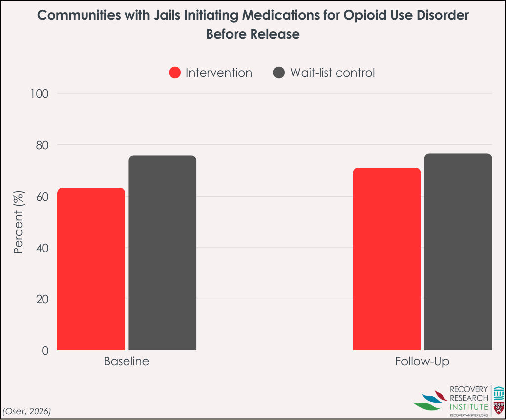 At the baseline survey, there were slight differences in the percentages of communities with jails that started people with opioid use disorder on medication treatment and linked them to medication treatment upon release. More communities in the waitlisted control group had jails that started people on medication treatment during incarceration or immediately prior to release (76%) compared to communities in the intervention group (63%).