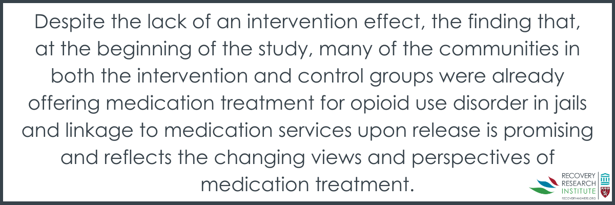Despite the lack of an intervention effect, the finding that, at the beginning of the study, many of the communities in both the intervention and control groups were already offering medication treatment for opioid use disorder in jails and linkage to medication services upon release is promising and reflects the changing views and perspectives of medication treatment.