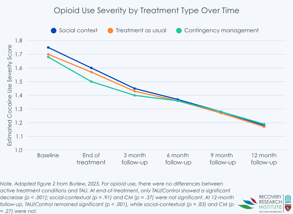Overall substance use severity decreased from baseline to the end of treatment for those in the treatment as usual condition. Social-contextual treatments did not differ from treatment as usual in change in overall substance severity from baseline to end of treatment. However, contingency management showed significant decreases in overall substance use severity relative to treatment as usual. From the end of treatment to 12 months, participants in the treatment as usual and social-contextual interventions continued to decrease overall substance use severity. There was no difference in change between social-contextual interventions and treatment as usual. There were differences in 12-month cocaine use severity between both treatment as usual and social-contextual interventions and contingency management in overall substance use severity. Like with cocaine use, overall substance use severity in the contingency management condition returned to baseline levels of severity by the 12-month follow up.