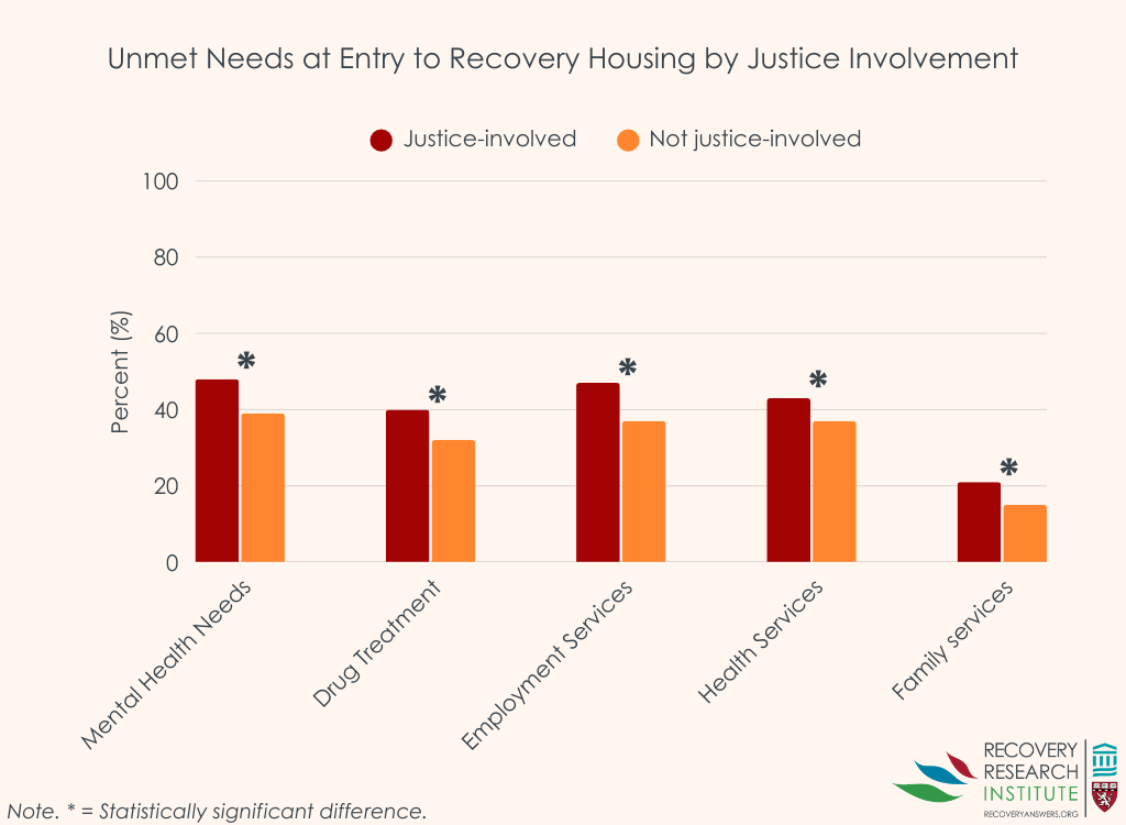 Upon entry into recovery housing, justice-involved residents reported substantially higher unmet needs across multiple service domains (see graph below).