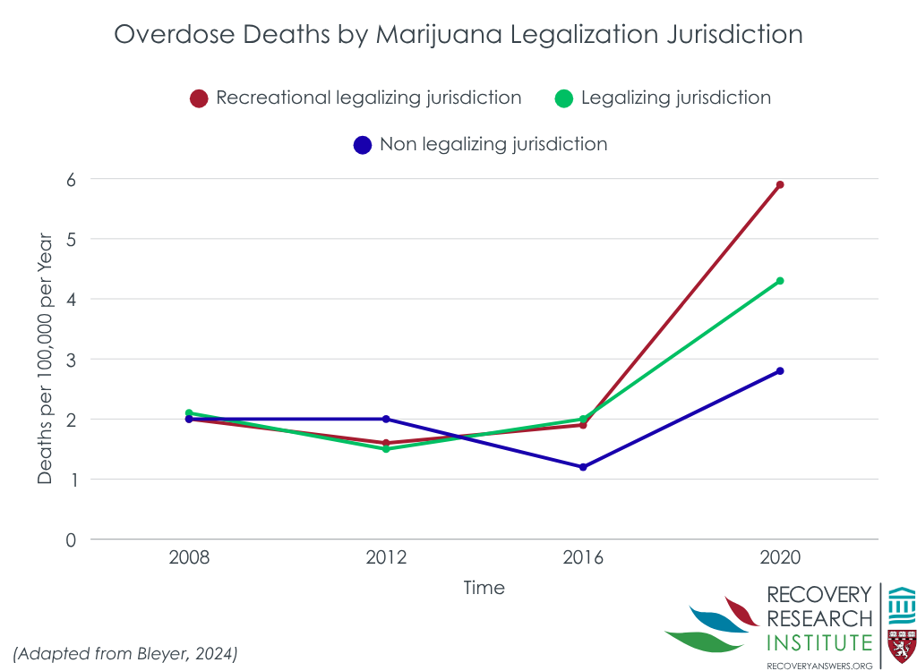 This study found that by 2021 jurisdictions that legalized adult recreational cannabis use had higher adolescent overdose death rates compared to jurisdictions that did not legalize any cannabis use. Because this study did not account for other state level factors that could affect both cannabis policy and opioid overdoses, the findings should be replicated with more rigorous adjustment for alternative explanations. Nevertheless, the findings are noteworthy as they echo other studies that show adult-level substance use policy may have unintended effects for adolescents. Additional safeguards, education, and supports for adolescents may be needed, especially in jurisdictions that have more liberal substance use policies.
