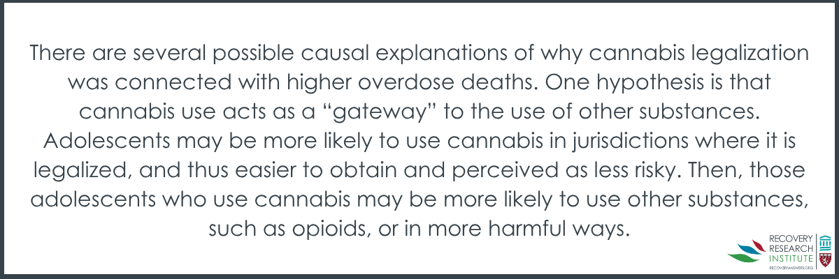 At the same time, there are several possible causal explanations of why cannabis legalization was connected with higher overdose deaths. One hypothesis is that cannabis use acts as a “gateway” to the use of other substances. Adolescents may be more likely to use cannabis in jurisdictions where it is legalized, and thus easier to obtain and perceived as less risky. Then, those adolescents who use cannabis may be more likely to use other substances, such as opioids, or in more harmful ways. The transition to the use of other substances and riskier use may lead to higher overdose deaths. More research is needed to more clearly identify and account for important factors in a young person’s substance use trajectory across jurisdictions.