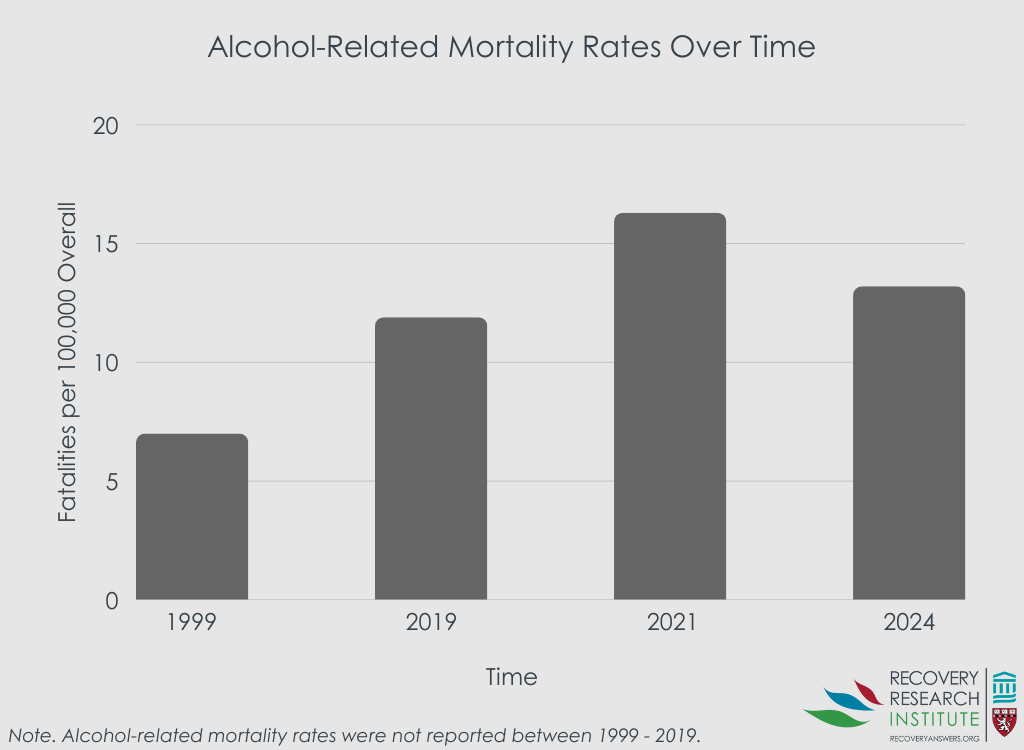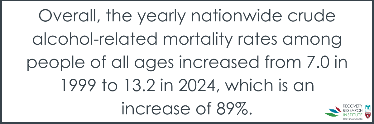 Overall, the yearly nationwide crude alcohol-related mortality rates among people of all ages increased from 7.0 in 1999 to 13.2 in 2024, which is an increase of 89%. Within this time period, mortality was the highest in 2021, with 54,258 total alcohol-related deaths. See graph below.