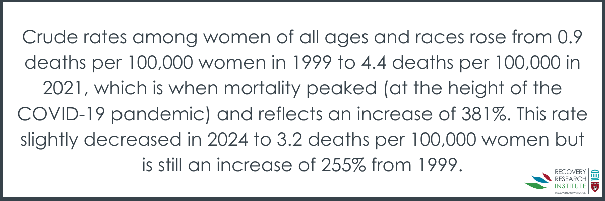 Although the overall crude mortality rate for men of all ages and races was consistently higher than those among women across the study time period, rates increased at a higher level among women than men. Crude rates among women of all ages and races rose from 0.9 deaths per 100,000 women in 1999 to 4.4 deaths per 100,000 in 2021, which is when mortality peaked (at the height of the COVID-19 pandemic) and reflects an increase of 381%. This rate slightly decreased in 2024 to 3.2 deaths per 100,000 women but is still an increase of 255% from 1999.