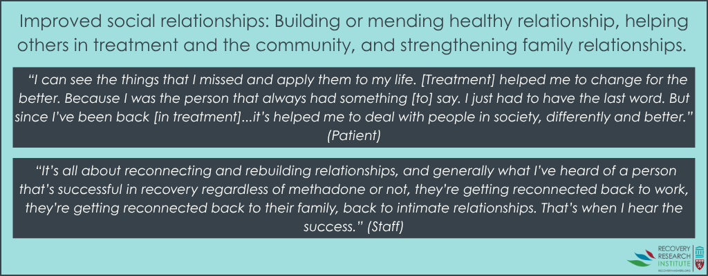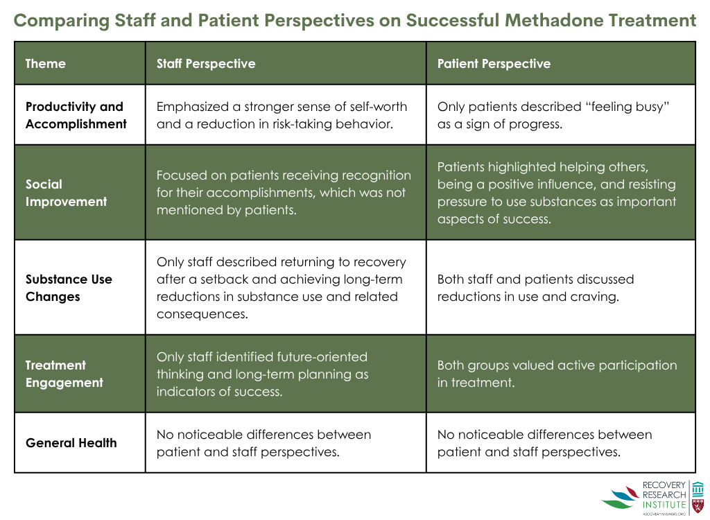 Findings from this qualitative study of patient and staff perspectives suggest that successful methadone treatment includes improvements in general health, productivity and accomplishment, social relationships, substance use, and treatment engagement. Notably, the study focused on racial minority patients who were primarily low-income and enrolled in a methadone treatment program. The results suggest it may be helpful for methadone programs to incorporate broader, person-centered outcomes into future program policies to support long-term recovery.