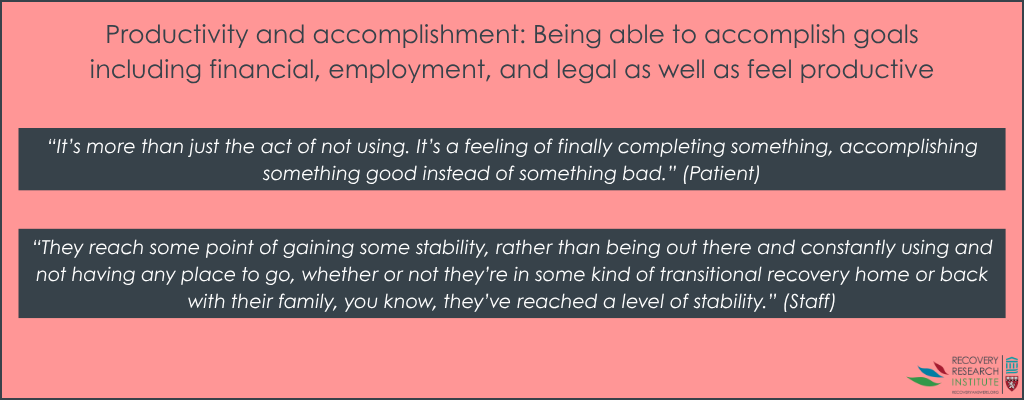 Productivity and accomplishment: Being able to accomplish goals including financial, employment, and legal as well as feel productive.