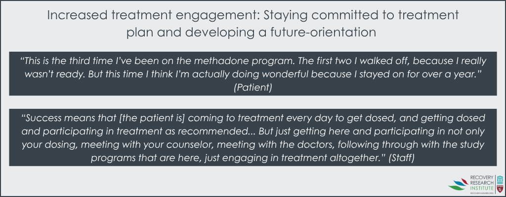 For treatment professionals and treatment systems: This study found that patients receiving methadone for opioid use disorder viewed treatment success as a holistic process that featured more than just abstinence and attending the treatment program. Exploring and support patient-centered goals in addition to reduced use may improve patient experiences and outcomes.